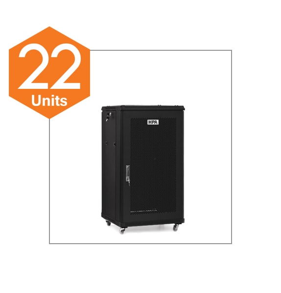 2- رک 22 یونیت ایستاده HpAsia دارای چرخ، یک عدد فن، پنل بازشو قفل دار، یک یسته پیچ و مهره رک