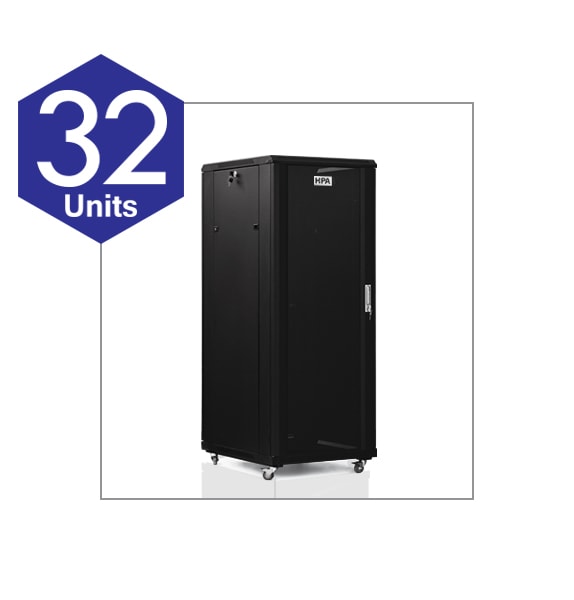 4- رک 32 یونیت ایستاده HpAsia دارای چرخ، یک عدد فن، پنل بازشو قفل دار، یک یسته پیچ و مهره رک